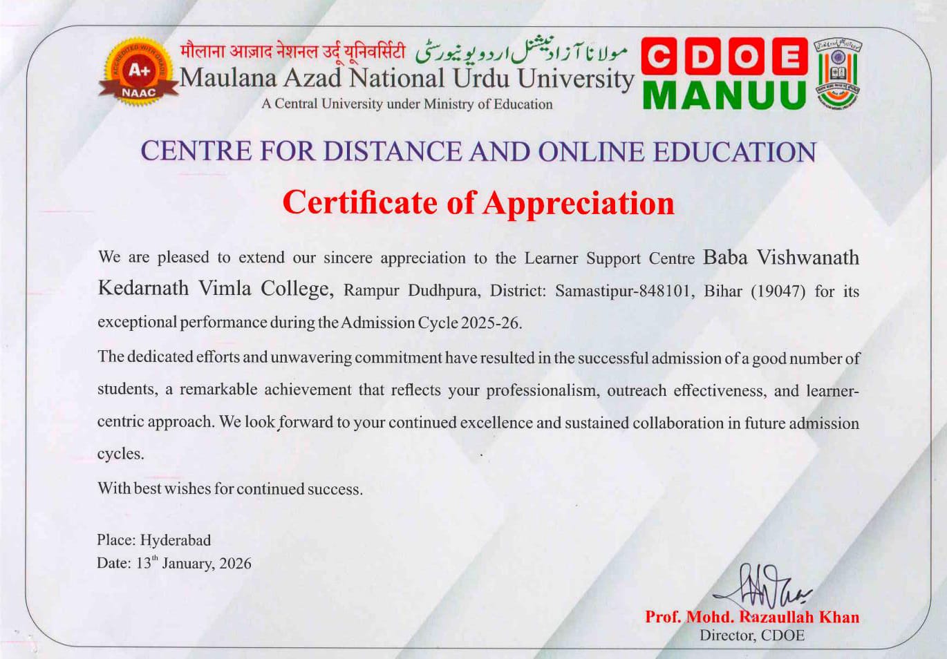 BVK Vimala College began its journey with an initial affiliation to Lalit Narayan Mithila University, Darbhanga, Bihar. However, in the same year of its establishment, the college transitioned to being affiliated with Maulana Mazharul Haque Arabic & Persian University, Patna. (Read More)
