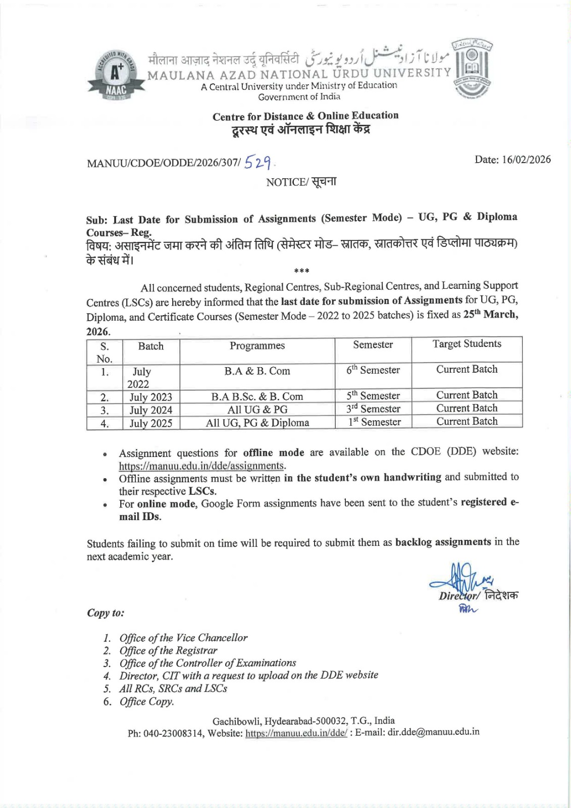 Last date for submission of Assignments (Semester Mode) of UG, PG, Certificate & Diploma Courses - Reg. Click Here